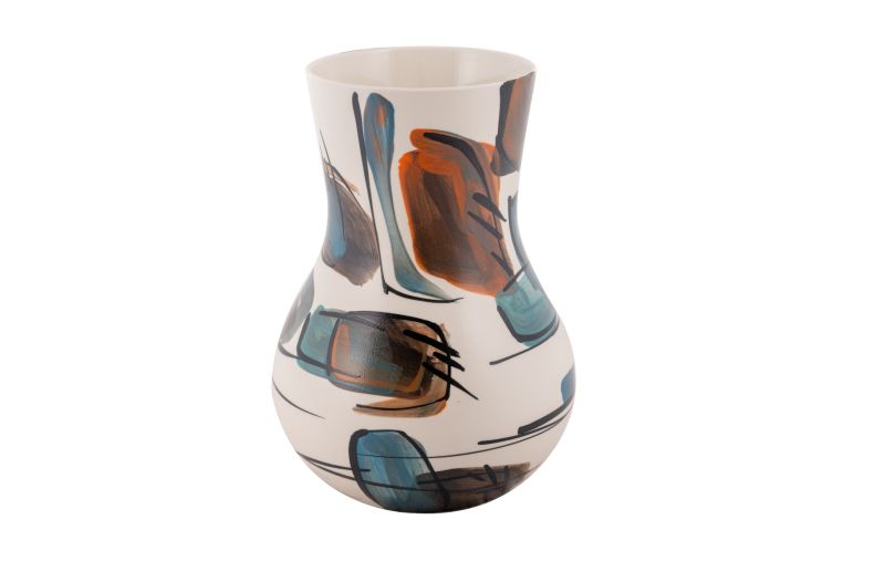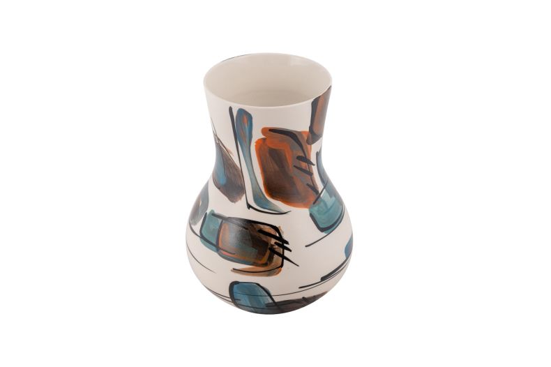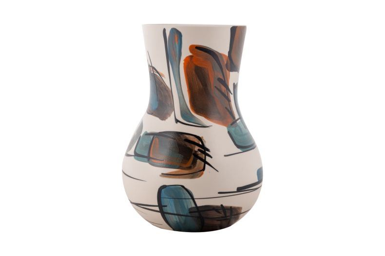 Vaso orgânico de cerâmica pintado artesanalmente em tons de azul e marrom, com fundo branco.